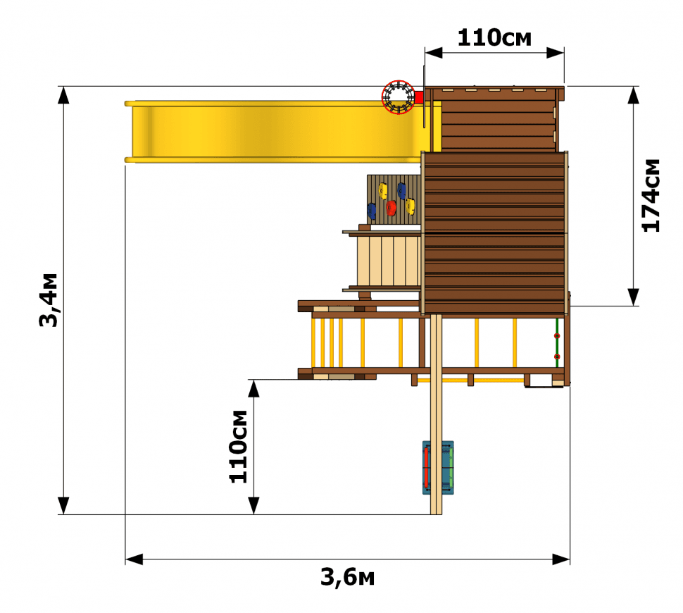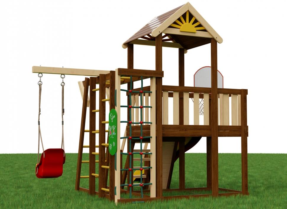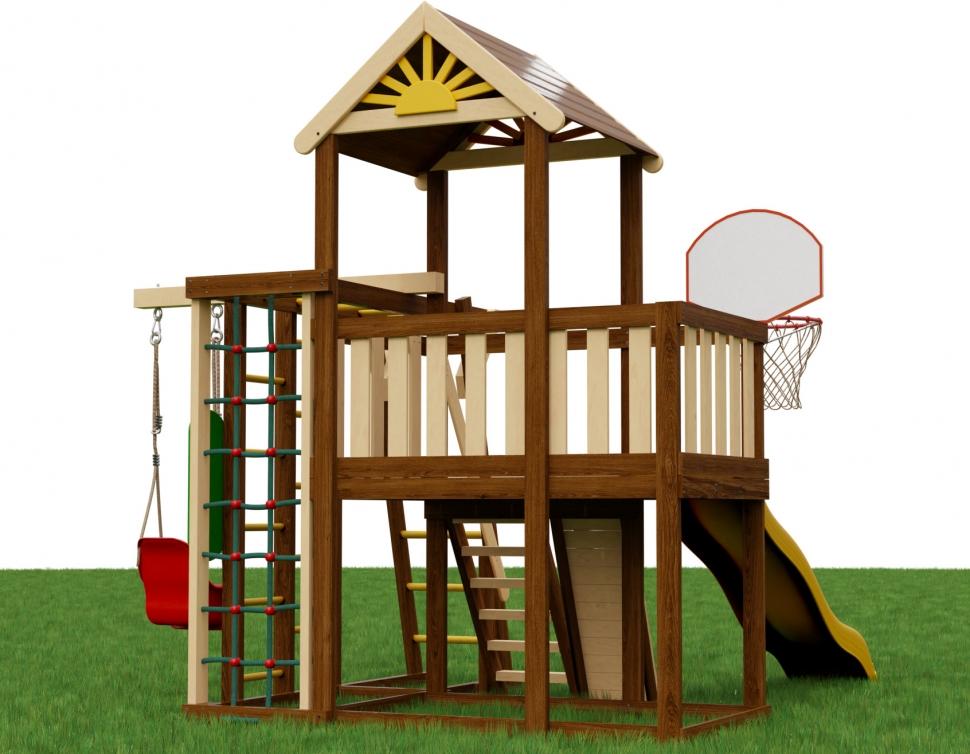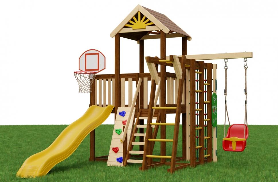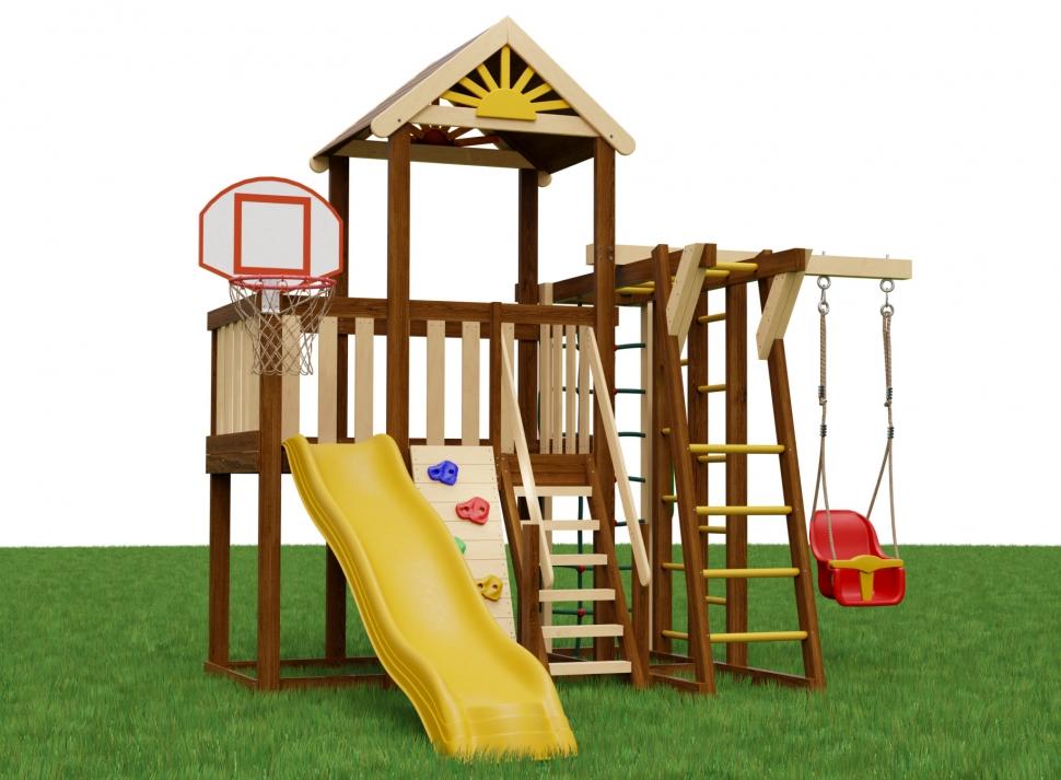 Игровая площадка «Бенто Марк 1» — это пространство для активных игр и движения. Высокая крыша с декоративным «солнышком» придаёт конструкции выразительный характер, а горка комфортной высоты дарит яркие эмоции. Спортивная часть продумана для развития силы и ловкости: элементы для подъёма, рукоход и сетка делают каждую игру динамичной и увлекательной. Комплектация: Основная игровая башня с деревянной крышей Безопасная лестница с перилами Горная стенка с пластиковыми "камнями" Горка с высоты 115см Баскетбольное кольцо с сеткой Доска для рисования мелом Модуль "Двойная шведская стенка" Модуль "Рукоход" Модуль "Канатная сетка" Качели со спинкой (на качельной балке) Анкера для крепления к грунту Крепеж Подробная инструкция по сборке Размеры: Основная башня 174х110см Высота пола - 115см Высота по коньку - 315см Размеры всей площадки - 3,6х3,4м Данные для доставки: Количество мест - 8шт Вес - 270кг Объем - 1,6м3