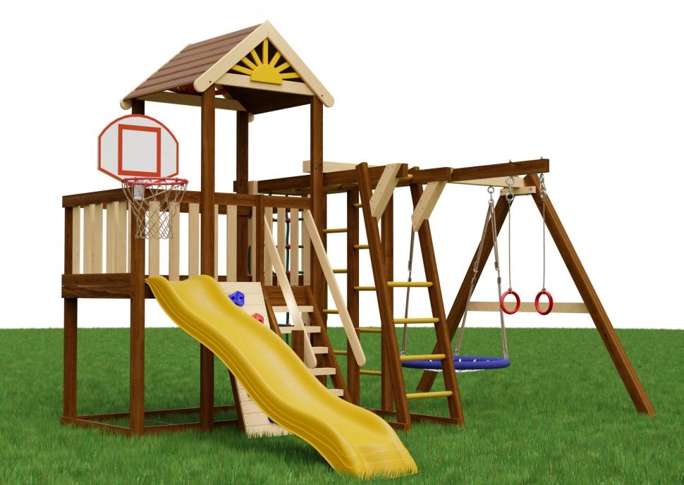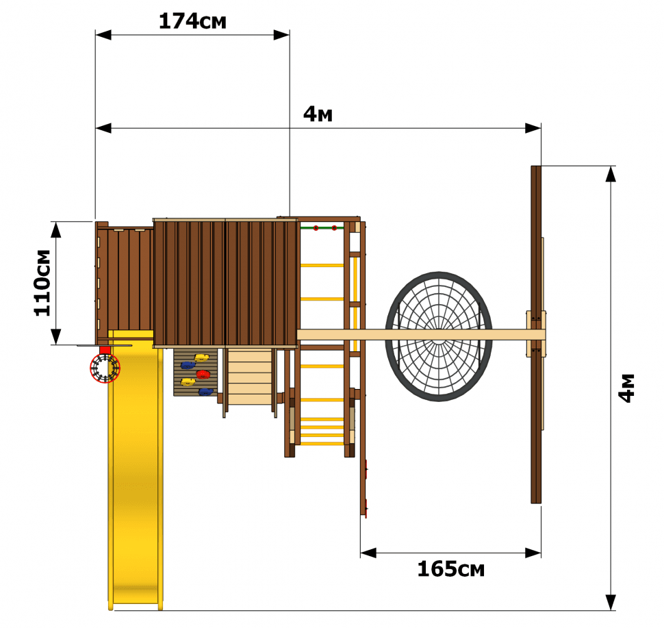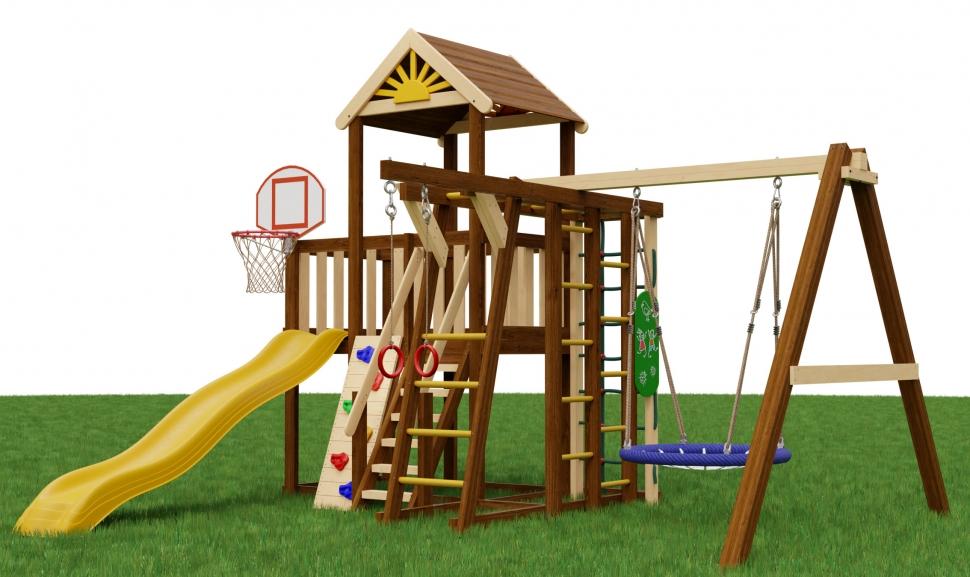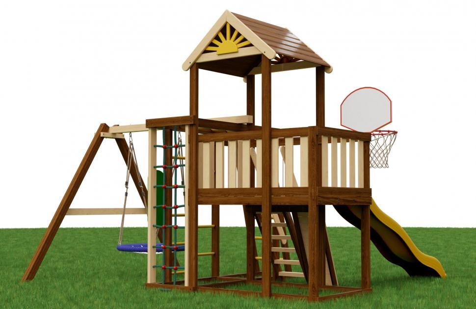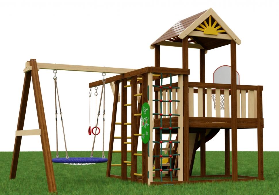 Игровая площадка «Бенто Марк 3» — это динамичное пространство для движения и ярких эмоций. Выразительная крыша с декоративным «солнышком» задаёт стиль всей конструкции, а горка комфортной высоты добавляет азарта в игру. Разнообразные элементы для подъёма и рукоход помогают развивать силу, ловкость и координацию. Особое удовольствие дарят качели «гнездо» — идеальное место для отдыха, раскачивания и весёлых игр. Комплектация: Основная игровая башня с деревянной крышей Безопасная лестница с перилами Горная стенка с пластиковыми "камнями" Горка с высоты 115см Баскетбольное кольцо с сеткой Доска для рисования мелом Модуль "Двойная шведская стенка" Модуль "Рукоход" Модуль "Канатная сетка" Модуль "Гимнастические кольца" (на отдельной балке) Модуль "Качели" с качелями "гнездо" диаметром 60см Анкера для крепления к грунту Крепеж Подробная инструкция по сборке Размеры: Основная башня 174х110см Высота пола основной башни - 115см Высота основной башни по коньку - 315см Размеры всей площадки - 4х4м Данные для доставки: Количество мест - 9шт Вес - 290кг Объем - 1,7м3