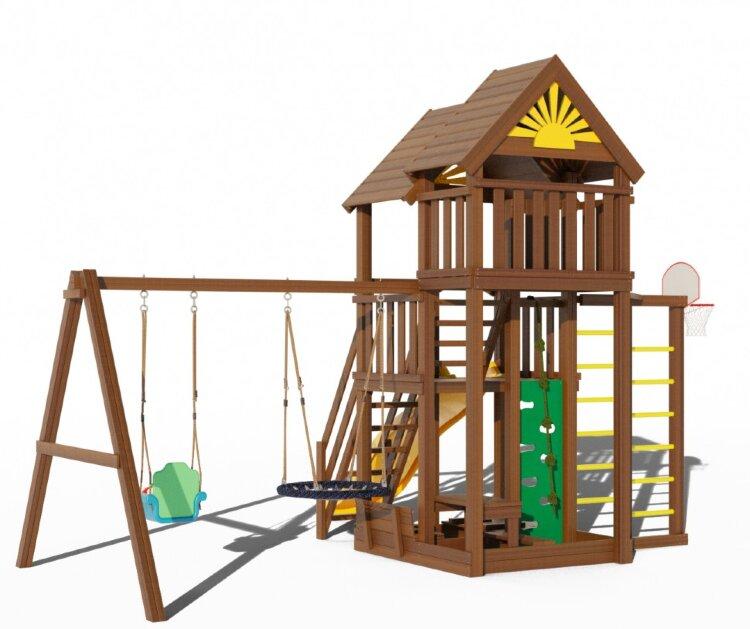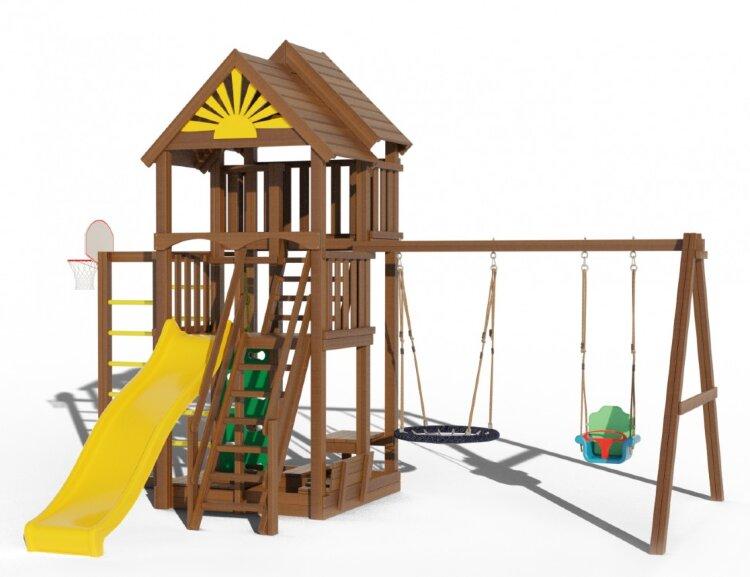 Ищете способы организовать безопасную игровую зону для детей на свежем воздухе – купите детскую площадку Клуб Сайгон 1. Это универсальный вариант, понравится и малышам, и деткам постарше. Качели со спинкой подойдут для младенцев, модель-гнездо позволяет не ограничивать фантазию в играх и способна выдержать вес взрослого человека. Пластиковая горка с "волна" исключает сильный разгон и имеет защитные бортики. Домик для игр оборудован высокими ограждениями и защищен от солнца и дождя деревянной крышей. Лавочка со спинкой и столик позволяет удобно расположиться с игрушками и раскрасками. Площадка изготовлена из карельской сосны первого сорта, тщательно отшлифована и покрашена безопасной краской Galamix. Универсальная цветовая гамма подходит для большинства загородных участков и гармонично сочетается с яркими желтыми солнышками. Размеры: Длина всей площадки - 640см Ширина всей площадки - 500см Длина качельной балки - 290см Высота всей конструкции - 400см Высота 1 этажа - 1,5м Высота второго этажа - 2,2м Длина игровой башни - 180см Ширина игровой башни - 152см Размеры крышки для песочницы: Ширина - 91см Длина - 152см Комплектация: Двухуровневая башня 1 уровень - высота 1,5м 2 уровень - высота 2,2м Горка длинная 3 метра Лестница со ступенями и перилами Лестница с первого этажа на второй Песочница с крышкой (при открывании трансформируется в лавочки со спинками) Столик с лавочкой Качели «гнездо» диаметром 1м (нагрузка до 100кг) Качели трансформер до 3х лет (3 в 1) Баскетбольное кольцо с сеткой и щитом Горная стенка (скалолазка) с канатом Двойная шведская стенка Крепеж Анкера металлические для крепления в грунт (40см) Подробная инструкция по сборке Все стойки выполнены из сборного бруса 90х90мм Высота всей конструкции 4 метра Данные для доставки: Вес - 430кг Объем - 1,7м3 Количество мест - 10