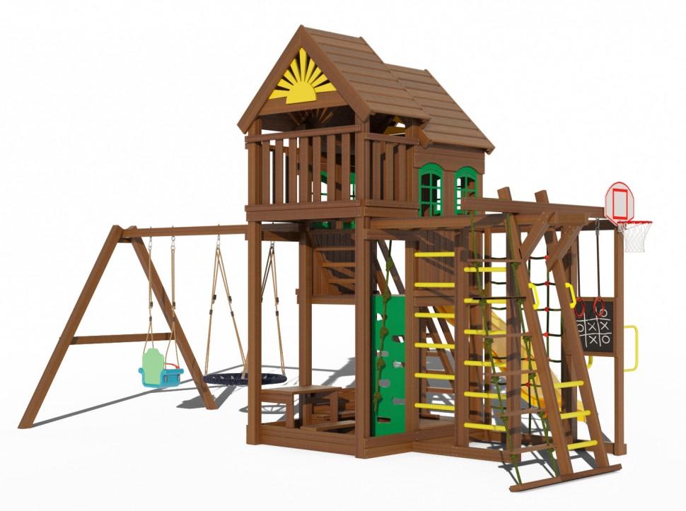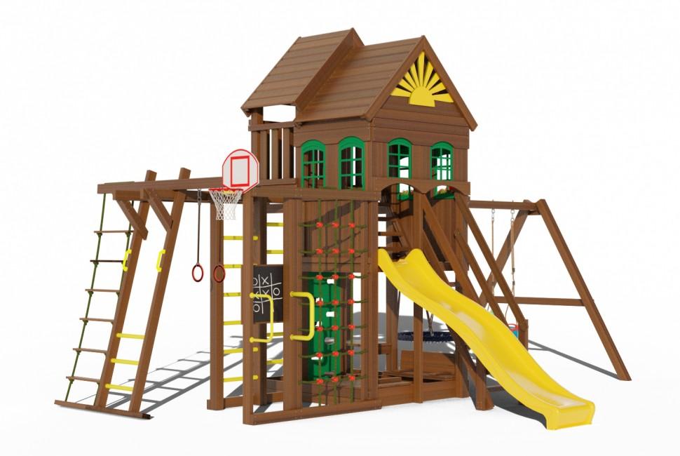 Хотите обеспечить детям безопасную активность на даче – купите детскую площадку Клуб Сайгон 3. Здесь есть все, что что необходимо для полноценного физического и умственного развития ребенка. Настоящий домик с окошками и цветочницей – основа для массы ролевых игр, разнообразные канатные и шведские стенки обеспечат выход физической активности, два варианта качелей подойдут и младенцам, и взрослым, а специальная доска позволяет рисовать мелом. Конструкция тщательно продумана, надежно закреплена и исключает вероятность травм. Карельская сосна износостойка, не боится погодных явлений, тщательно отшлифована и покрыта безопасной краской. Размеры: Длина всей площадки - 640см Ширина всей площадки - 500см Длина качельной балки - 290см Высота всей конструкции - 400см Высота 1 этажа - 1,5м Высота второго этажа - 2,2м Длина игрового домика - 180см Ширина игрового домика - 152см Размеры крышки для песочницы: Ширина - 91см Длина - 152см Комплектация: Двухуровневая башня 1 уровень - высота 1,5м 2 уровень - высота 2,2м Горка длинная 3 метра Лестница со ступенями и перилами Лестница с первого этажа на второй Песочница с крышкой (при открывании трансформируется в лавочки со спинками) Столик с лавочкой Качели «гнездо» диаметром 1м (нагрузка до 100кг) Качели трансформер до 3х лет (3 в 1) Баскетбольное кольцо с сеткой и щитом Горная стенка (скалолазка) с канатом Двойная шведская стенка Домик на втором этаже с пластиковыми окошками (6шт) Цветочницы (2шт) Рукоход Сетка для лазания Доска для рисования мелом Брусья гимнастические Кольца гимнастические Веревочная лестница Пластиковые ручки на рукоход Крепеж Анкера металлические для крепления в грунт (40см) Подробная инструкция по сборке Все стойки выполнены из сборного бруса 90х90мм Высота всей конструкции 4 метра Данные для доставки: Вес - 495кг Объем - 2м3 Количество мест - 12
