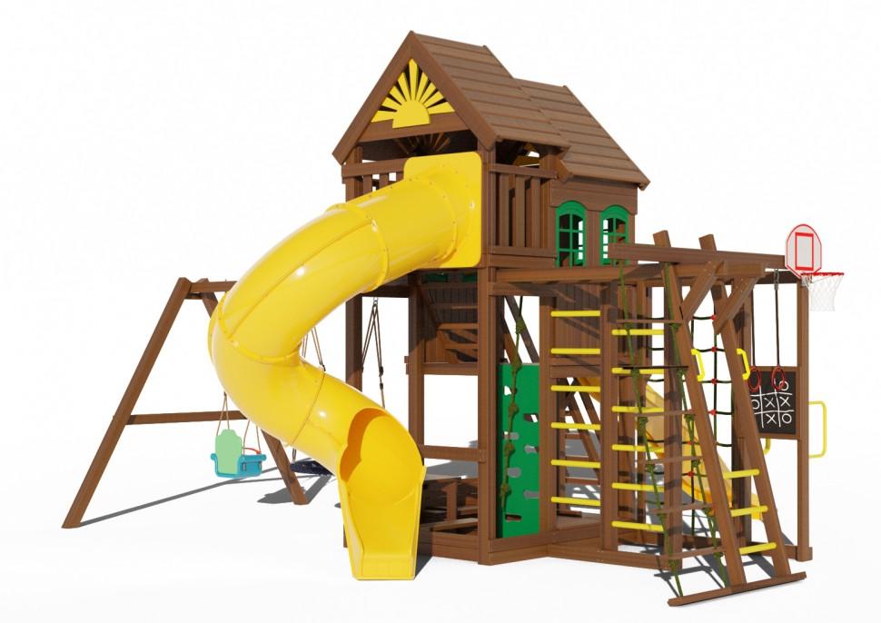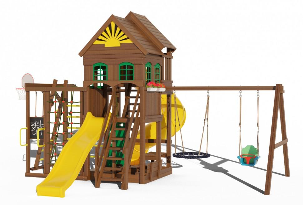 Купить детскую площадку Клуб Сайгон 5 – решить вопрос с потребностями в играх и развлечениях детей на долгие годы. Здесь есть все, что только можно вообразить. Закрытый домик с окошками и цветочницами позволяет играть в любое время года, несмотря на осадки, разнообразные веревочные и шведские стенки – лучший способ слить энергию, две горки, в том числе «Труба», решают вопрос конкуренции. Для самых маленьких – безопасные качели и лавочка со столиком, предназначенные для комфортных игр на свежем воздухе. Конструкция продумана до мелочей и безопасна. Карельская сосна 1 сорта устойчива к смене погодных явлений, не гниет и не рассыхается со временем. Размеры: Длина всей площадки - 640см Ширина всей площадки - 500см Длина качельной балки - 290см Высота всей конструкции - 400см Высота 1 этажа - 1,5м Высота второго этажа - 2,2м Длина игрового домика - 180см Ширина игрового домика - 152см Размеры крышки для песочницы: Ширина - 91см Длина - 152см Комплектация: Двухуровневая башня 1 уровень - высота 1,5м 2 уровень - высота 2,2м Горка длинная 3 метра Лестница со ступенями и перилами Лестница с первого этажа на второй Песочница с крышкой (при открывании трансформируется в лавочки со спинками) Столик с лавочкой Качели «гнездо» диаметром 1м (нагрузка до 100кг) Качели трансформер до 3х лет (3 в 1) Баскетбольное кольцо с сеткой и щитом Горная стенка (скалолазка) с канатом Двойная шведская стенка Домик на втором этаже с пластиковыми окошками (6шт) Цветочницы (2шт) Рукоход Сетка для лазания Доска для рисования мелом Брусья гимнастические Кольца гимнастические Веревочная лестница Горка «труба» с высоты 2,2метра Пластиковые ручки на рукоход Крепеж Анкера металлические для крепления в грунт (40см) Подробная инструкция по сборке Все стойки выполнены из сборного бруса 90х90мм Высота всей конструкции 4 метра Данные для доставки: Вес - 510кг Объем - 2,2м3 Количество мест - 13