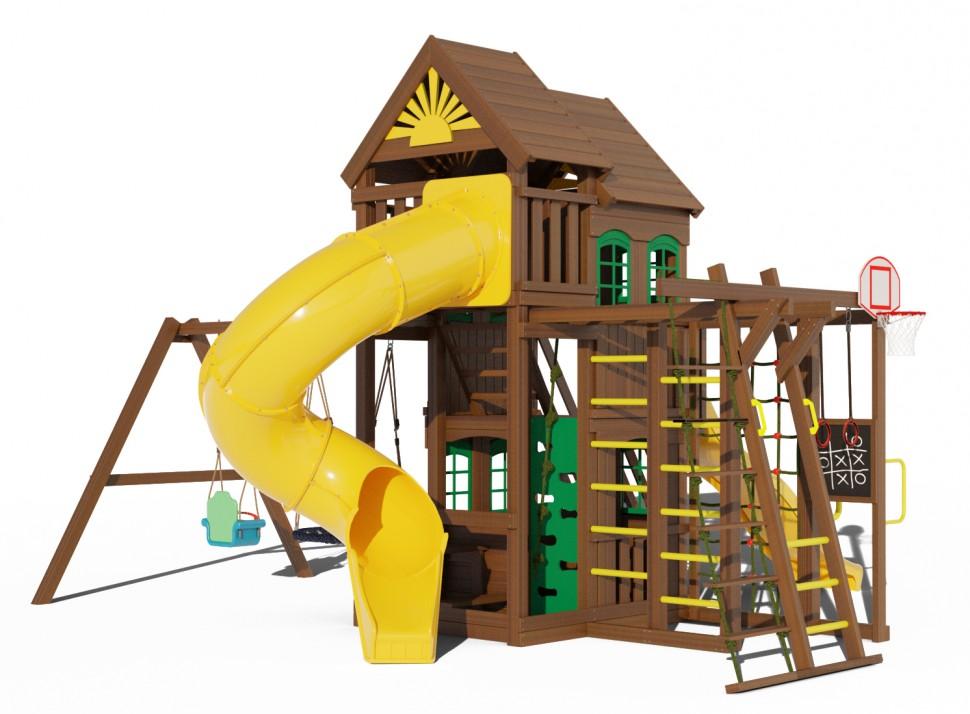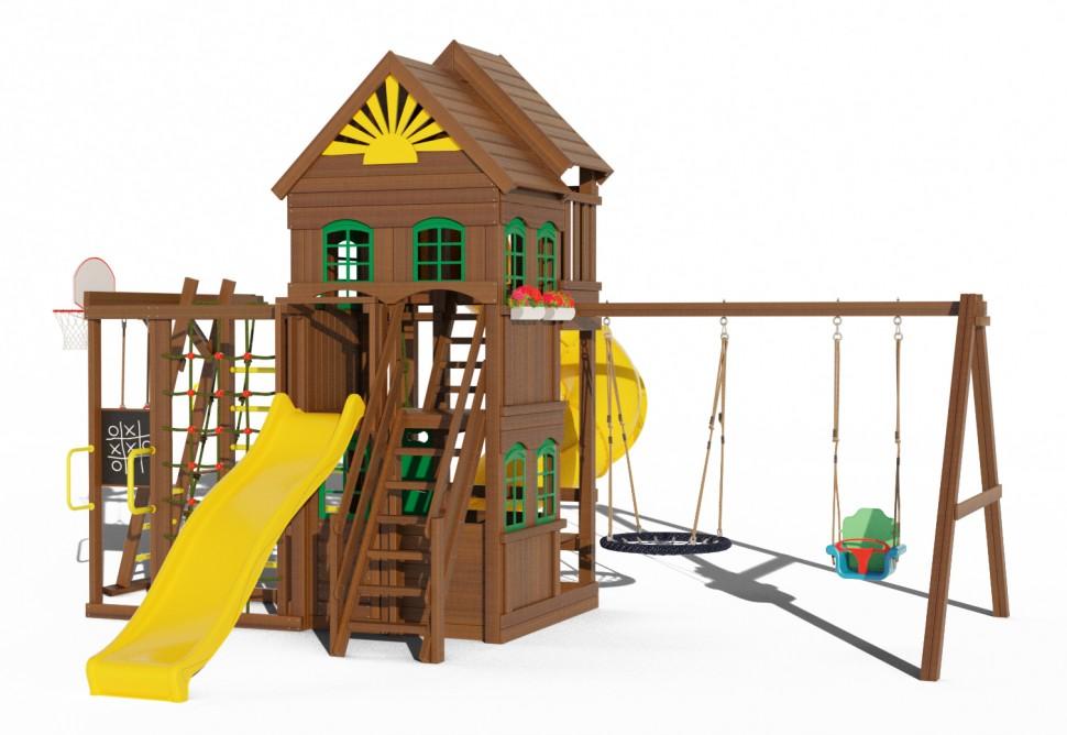 Домик для игр – это мечта любого ребенка. А если двухэтажный, почти как настоящий, с окошками? А если еще и с горками, качелями и шведскими стенками? Это не фантастика, а вполне реальный игровой комплекс, и многие годы он может радовать ваших детей – достаточно просто купить детскую игровую площадку Клуб Сайгон 7. Выверенный до мелочей дизайн, приятное глазу сочетание цветов и все возможные элементы для умственного и физического развития как малышей, так и детей постарше. Комплекс выполнен из карельской сосны 1 сорта, долго не теряющей своих качеств, тщательно отшлифован, и покрашен гиппоаллергенной краской Galamix. Размеры: Длина всей площадки - 640см Ширина всей площадки - 500см Длина качельной балки - 290см Высота всей конструкции - 400см Высота 1 этажа - 1,5м Высота второго этажа - 2,2м Длина игрового домика - 180см Ширина игрового домика - 152см Комплектация: Двухуровневая башня 1 уровень - высота 1,5м 2 уровень - высота 2,2м Горка длинная 3 метра Лестница со ступенями и перилами Лестница с первого этажа на второй Столик с лавочкой Качели «гнездо» диаметром 1м (нагрузка до 100кг) Качели трансформер до 3х лет (3 в 1) Баскетбольное кольцо с сеткой и щитом Горная стенка (скалолазка) с канатом Двойная шведская стенка Домик на втором этаже с пластиковыми окошками (6шт) Домик на первом этаже с пластиковыми окошками (3шт) Цветочницы (2шт) Рукоход Сетка для лазания Доска для рисования мелом Брусья гимнастические Кольца гимнастические Веревочная лестница Горка «труба» с высоты 2,2метра Пластиковые ручки на рукоход Крепеж Анкера металлические для крепления в грунт (40см) Подробная инструкция по сборке Все стойки выполнены из сборного бруса 90х90мм Высота всей конструкции 4 метра Данные для доставки: Вес - 580кг Объем - 2,4м3 Количество мест - 15