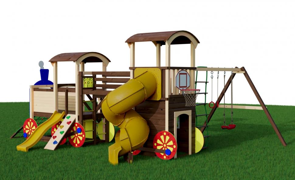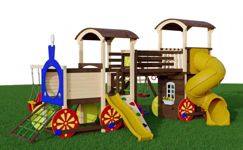 Детский игровой комплекс «Паровозик «CRUISER 5» это лучшее решение для развития физической сноровки, ловкости и хорошего настроения от подвижных игр на свежем воздухе. Развивающая игровая площадка рассчитана на большую группу одновременно играющих детишек, так как она оснащена множеством занимательных спортивных модулей. Здесь есть подвесной мостик и канатная лазалка, модуль с вращающимися кубиками и скалодром, два вида горок и три вида качелей, гимнастические кольца, подвесная лестница, активизирующие моторику пальчиков яркие кубики. Все элементы выполнены из качественных материалов и будут радовать малышей не один год. Товар можно приобрести в нашем интернет-магазине по доступной цене. С доставкой по всем регионам России. Менеджеры сайта помогут разобраться с условиями оплаты. Оплата осуществляется при получении или безналичной формой расчета. Комплектация CRUISER 5 Основная игровая башня в виде паровоза Горка пластиковая с высоты 90см Горная стенка с пластиковыми зацепами Канатная стенка (спереди) Малая качельная балка с качелями «со спинкой» Безопасная лестница с перилами Шведская стенка Модуль «крестики - нолики» Мостик между двумя башнями с безопасными перилами Модуль «Рукоход» на мостике Качели «гнездо» диаметром 60см под мостиком Дополнительная игровая башня с игровым домиком и окошками Цветочница Баскетбольное кольцо с сеткой Горка "Труба" Модуль «качели» с канатной лестницей, гимнастическими кольцами и качелями «Прямые (40см)» Длина качельной балки - 290см В комплекте подробная инструкция для самостоятельной сборки и анкера для крепления к поверхности