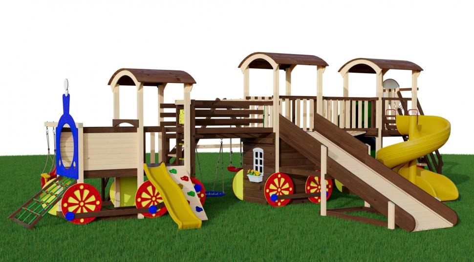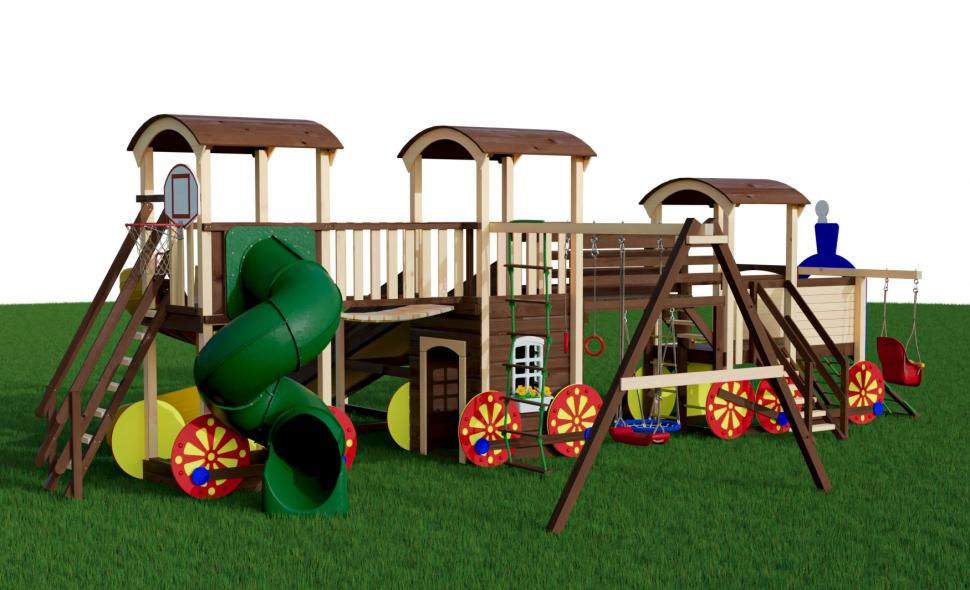 Многофункциональный всесезонный городок CRUISER 7 предназначен для активного отдыха в летнее и зимнее время. Комплектация представлена многочисленными игровыми модулями: горками, качелями, песочницей. Оригинальная конструкция в виде паровозика полностью реализует потребность детишек в подвижных играх. Цветные детали радуют глаз яркими красками, помогают ориентироваться в многообразии игровых элементов. Деревянные арочные крыши защищают от солнечных лучей или внезапного дождя. Для зимнего отдыха предназначен зимний заливной скат. Деревянные детали тщательно отшлифованы, декоративные элементы выкрашены безопасной для здоровья малышей краской. Комплектация CRUISER 7 Основная игровая башня в виде паровоза Горка пластиковая с высоты 90см Горная стенка с пластиковыми зацепами Канатная стенка (спереди) Малая качельная балка с качелями «со спинкой» Безопасная лестница с перилами Шведская стенка Модуль «крестики - нолики» Мостик между двумя башнями с безопасными перилами Модуль «Рукоход» на мостике Качели «гнездо» диаметром 60см под мостиком Дополнительная игровая башня с игровым домиком и окошками Цветочница Зимний заливной скат длиной 4 метра для катания на тюбинге Модуль «качели» с канатной лестницей, гимнастическими кольцами и качелями «Прямые (40см)» Длина качельной балки - 290см Канатный мостик между двумя дополнительными башнями с безопасными перилами Дополнительная башня с песочницей и лавочками под игровой платформой Горка «Труба» Горка «Спираль» Безопасная лестница с деревянными перилами Баскетбольное кольцо с сеткой В комплекте подробная инструкция для самостоятельной сборки и анкера для крепления к поверхности