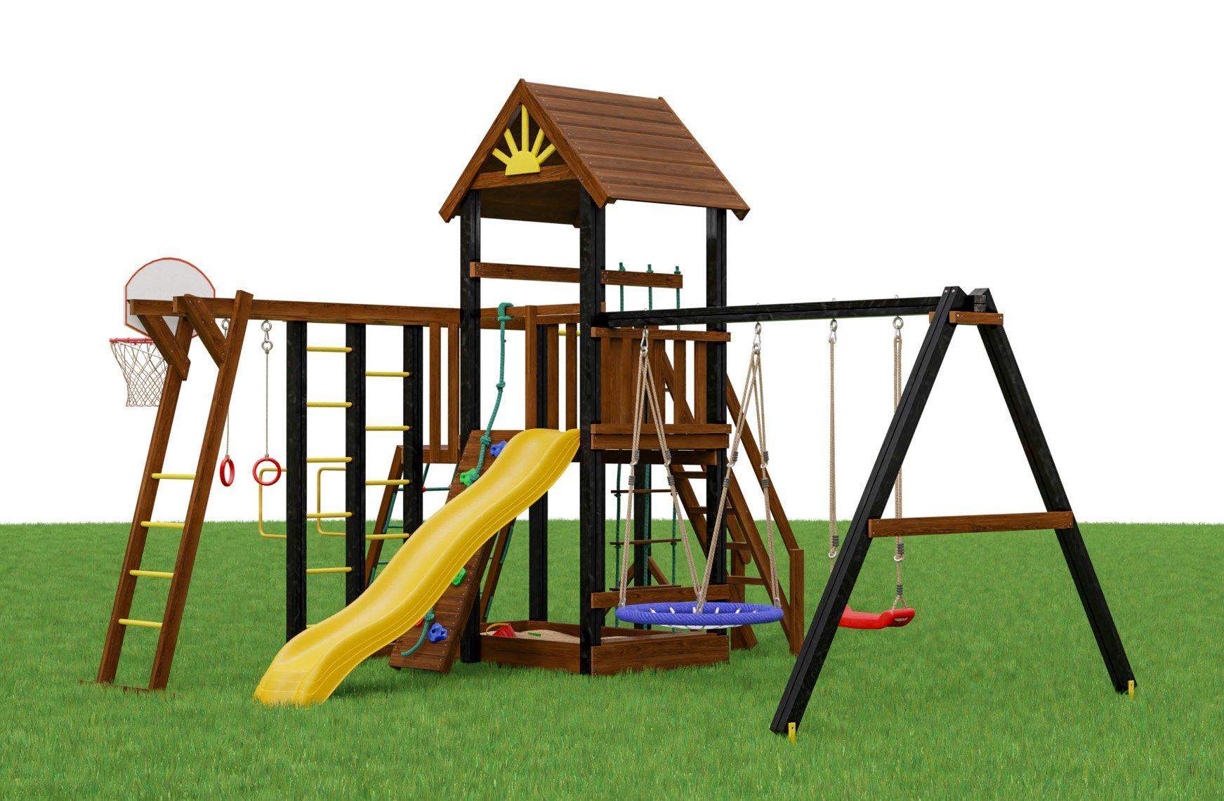 Полноценный детский спортивный комплекс во дворе дома? Это возможно с игровой площадкой «Марк 5» из массива сосны. Экологичный материал – не единственное преимущество конструкции. Родители в нем ценят большой потенциал для физического развития ребенка. Площадка сочетает в себе спортивные модули, которые интересны детям любого возраста: шведскую стенку, качели, веревочную лестницу, горную стенку, гимнастические кольца, рукоход, брусья, сетку для лазания. Игры и занятия на них укрепят все мышцы, повысят аппетит, улучшат координацию, сделают более ловким. Наличие функционального спортивного комплекса во дворе – это лучшая защита от гиподинамии, которая признана бичом современности. Несущие стойки площадки выполнены из массива сосны, качели - сборный брус 90х95мм. Купить игровую площадку в полной комплектации (все модули плюс крепежи) вы можете в нашем интернет-магазине. Мы доставим ее в города России, также произведем профессиональную сборку. Комплектация детской площадки Марк 5: Игровая башня с деревянной крышей и «Солнышком» Удобный пластиковый скат (3 метра) цвет на выбор Качели «гнездо» (цвет на выбор) Качели «Прямые» (цвет на выбор) Песочница с лавочкой и спинкой (без песка) Горная стенка с канатом Баскетбольный щит с сеткой Шведская станка двойная Веревочная лестница Безопасная лестница с перилами Металлические анкера для крепления к грунту Крепеж Подробная инструкция по сборке Рукоход Кольца гимнастические Модуль «Турник» Сетка для лазания (на второй этаж) Брусья гимнастические (на шведской стенке) Информация для доставки: Количество упаковок (мест) - 11шт Объем - 1.8м3 Вес - 295кг Дополнительно: Крышка на песочницу съемная из двух половинок: 9500р