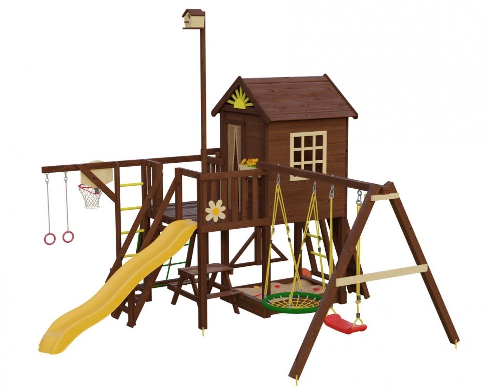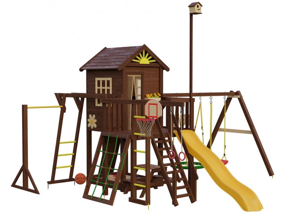 На втором этаже находится большой просторный домик размером 126х145см. Кроме того, есть разнообразные игровые модули, такие как турник, канатная сетка, шведская стенка, гимнастические кольца, рукоход, задний лаз в домик и многое другое. В этой площадке также есть уютная шторка на домике, которая прикрывает вход от насекомых. А с песочницей под игровым домиком дети могут проводить целые часы, играя и фантазируя. Отличительной особенностью игровых домиков серии "Mark House" является фирменный элемент "солнышко" на крыше, декоративные ромашки а также наличие скворечника возвышающегося над всей конструкцией Комплектация: Двухцветный домик с деревянной крышей и элементом "солнышко" Столик с двумя стульчиками внутри домика Деревянные декоративные окошки Цветочница Скворечник Анти москитная сетка для входа в домик Декоративные ромашки - 3шт Просторный балкон размерами 109х187см Удобная лестница с перилами Песочница под домиком с двумя лавочками по бокам Столик "пик-ник" с двумя лавочками под балконом (при необходимости столик "пик-ник" можно перенести в любое место) Модуль "турник" длиной 1 метр Модуль "канатная сетка" Модуль "шведская стенка с гимнастическими кольцами" Модуль "рукоход" Баскетбольное кольцо с сеткой Задний лаз в домик Горная стенка с пластиковыми камнями Горка длиной 3 метра Качельная балка с качелями "Гнездо" диаметром 60см Качели "лодочка" Анкера для крепления к основанию - 5шт Крепеж Подробная инструкция по сборке Размеры: Длина 6м Ширина 5,8м Высота по коньку 3,5м Высота балкона и домика 144см Длина качельной балки 280см Размеры балкона: Длина 109см Ширина 187см Размеры домика: Длина 145см Ширина 126см Высота от пола до начала крыши 132см Высота от пола до конька 195см Внутренний столик 55х28см с возможностью установки на любой высоте Стульчики 25х19см высотой 35см Размеры песочницы: Длина 145см Ширина 126см Высота бортиков 20см Данные для доставки: Вес 550кг Объем 2,6м3