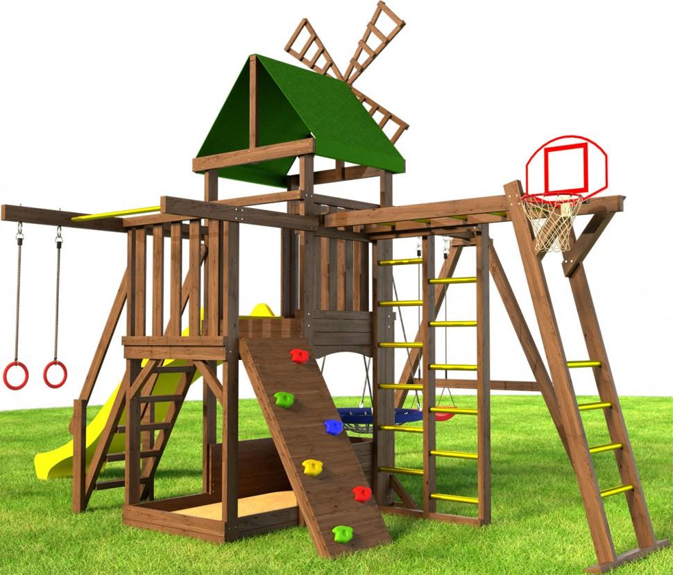 Не знаете, чем занять маленьких непосед на свежем воздухе — купите игровую площадку «Мельница люкс». Это целый комплекс безопасных развлечений. Одно из главных — башня, стилизованная под мельницу. Лопасти делают конструкцию аутентичной. Наверху — прочный тент, по желанию покупателя его легко заменить на деревянную крышу. Подняться на башню можно по широкой лестнице либо по горной стенке с зацепами — вариант для тех, кто хочет развить ловкость. Спортивной составляющей уделено большое внимание. Конструкция оборудована шведской стенкой, гимнастическими кольцами, баскетбольным кольцом с сеткой, а также модулями «Турник» и «Рукоход». Для малышей есть небольшой домик на нижнем уровне и качели. Одно сиденье прямое, второе выполнено в форме «гнезда» — широкое и прочное оно выдержит значительный вес. При разработке игровой площадки «Мельница люкс» было уделено большое внимание надежности материалов и креплений. Комплекс изготовлен из карельской сосны 1 сорта. Природное сырье не боится капризов погоды в наших широтах. Древесина не рассыхается, не ломается и не гниет. Краска Galamix обеспечивает дополнительную защиту. Сверхпрочные пигменты не выгорают и не отслаиваются. Метод полного погружения исключает непрокрашенные участки. Размеры: Длина - 5,2м Ширина - 5,4м Высота игровой платформы (спуска с горки) - 1,45м Высота всей конструкции - 3,9м Комплектация: Игровая башня в виде мельницы Песочница (под балконом) Качели (каркас) (сечение 90х90) длина качельной балки - 250см Качели "лодочка" - 1шт Качели гнездо диаметром 60см - 1шт Горка 2,9 метра с высоты 1,45метра Балкон Модуль "игровой домик" на 1 этаже Модуль "двойная шведская стенка" Модуль "Рукоход" Модуль "Турник" Баскетбольное кольцо с сеткой Лестница со ступенями и перилами Крыша тентовая Горная стенка (6 выступов для скалолазания) Анкера металлические для крепления в грунт (6шт) Подробная инструкция по сборке Данные для доставки: Вес 230кг Объем 1.2м3 6 мест (4 коробки + горка) Размеры