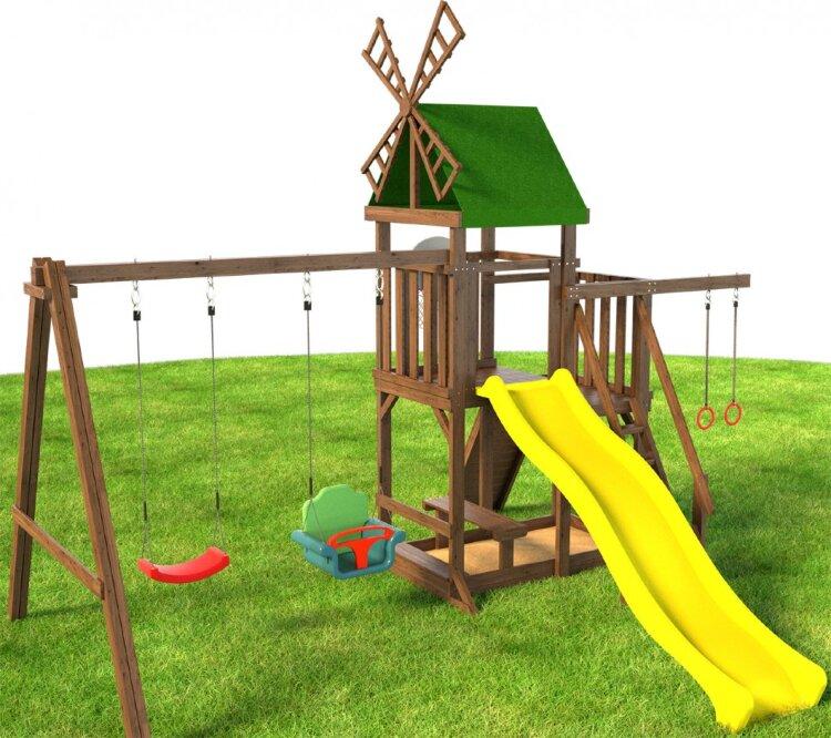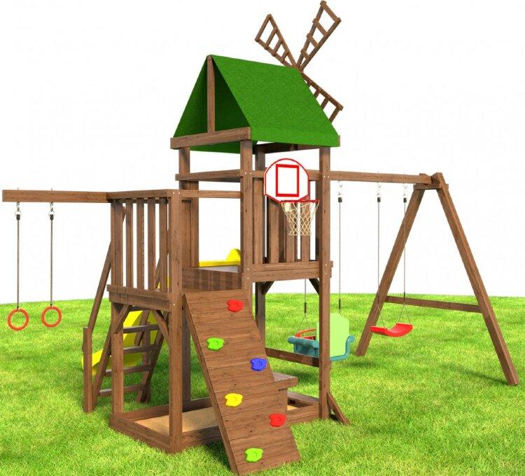 Если вы хотите организовать безопасный и увлекательный досуг детей разного возраста, вам следует купить игровую площадку «Мельница уют». Башня, стилизованная под мельницу, обязательно вызовет интерес. Крыша — прочный красочный тент или деревянный настил по желанию покупателя. На защищенный балкон ведет широкая лестница с перилами. Альтернативный вариант подъема для смелых и ловких — горная стенка. Внизу для малышей предусмотрен столик и лавочка со спинкой. Гимнастические кольца и баскетбольное кольцо развивают меткость, упорство и выносливость. С противоположной стороны от спортивных снарядов расположены качели с 2 сиденьями. Одно предназначено для детей до 3-х лет. Комплекс изготовлен из карельской сосны 1 сорта. Этот вид древесины не гниет и не трескается под воздействием погодных явлений. Все детали игровой площадки «Мельница уют» прошли многочисленные циклы шлифования. Окрашивание производилось методом полного окунания. Размеры: Длина - 4,1м Ширина - 5,2м Высота игровой платформы (спуска с горки) - 1,45м Высота всей конструкции - 3,9м Комплектация: Игровая башня в виде мельницы Песочница (под игровой башней) Качели (каркас) (сечение 90х90) длина качельной балки - 250см Качели "лодочка" - 1шт Качели "2 в 1" - 1шт Горка 2,9 метра с высоты 1,45метра Балкон Столик с лавочкой и со спинкой Баскетбольной кольцо с сеткой Модуль гимнастические кольца Лестница со ступенями и перилами Крыша тентовая Дополнительная опция: Деревянная крыша Горная стенка (6 выступов для скалолазания) Анкера металлические для крепления в грунт (4шт) Подробная инструкция по сборке Данные для доставки: Вес 180кг Объем 1.1м3 5 мест (4 коробки + горка) Размеры мест: 270х25х25см - 2шт 140х30х30см = 1шт 60х40х2,9м - горка (1шт) 40х40х25см - коробка с фурнитурой Дополнительная опция: Деревянная крыша + 8000р к стоимости